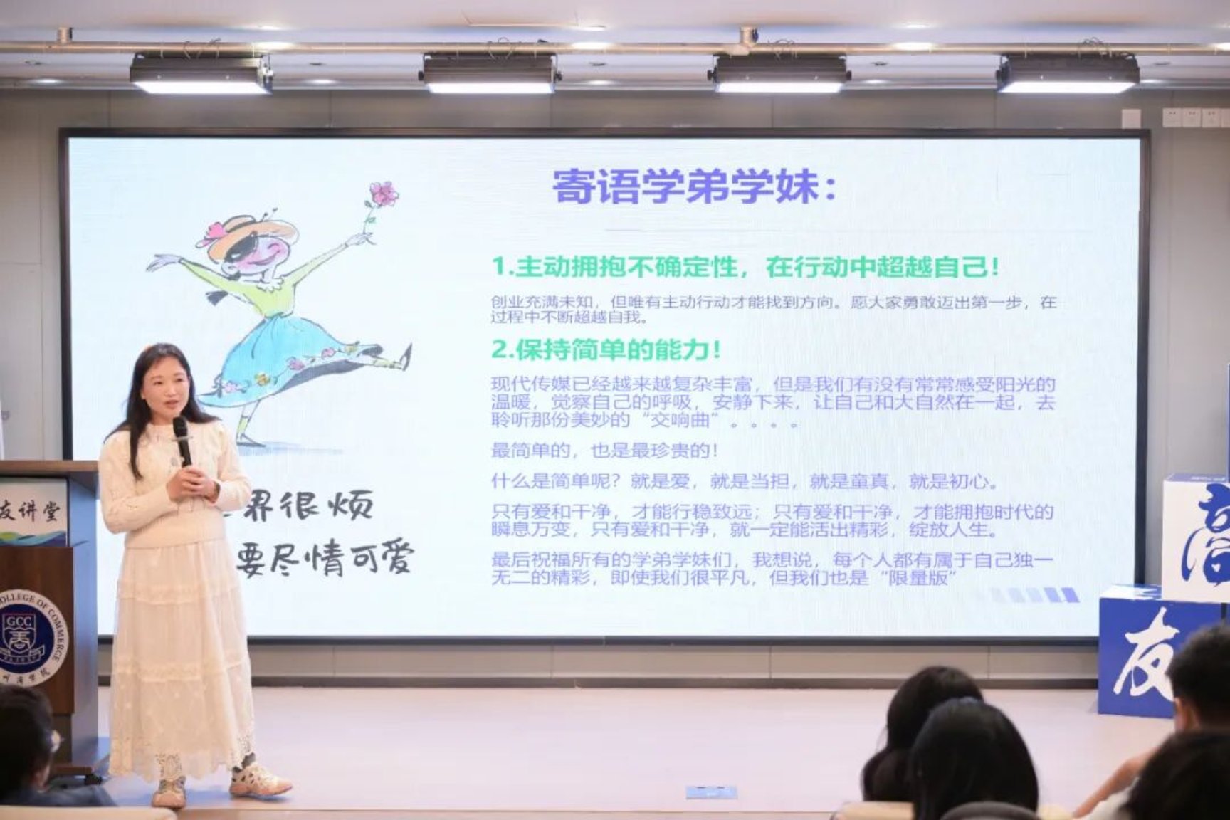 面对创业困境,她分享道:疫情期间,公司面临巨大挑战。作为某高校的供应商,因为学校财政缩减,业绩受到影响。但在贵人帮助下,她的公司最终渡过了难关。“即使我们很平凡,但我们也是‘限量版’。”刘欣欣以这句充满温度的话语结束分享,鼓励每位学子活出独一无二的精彩。