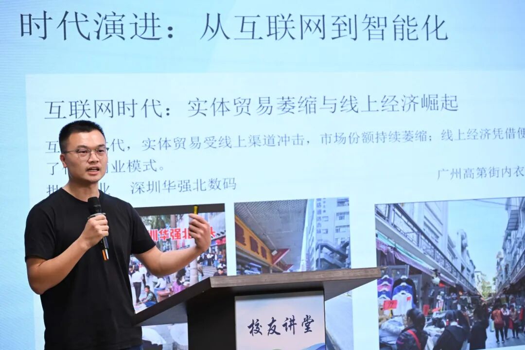 苏章洪用自己创业初期的经历作为引子。2011年他刚毕业时,正值电商崛起的风口,他铆足了劲扎进互联网零售赛道,从淘宝做到天猫,从国内做到出海。“那个时候,华强北还是人山人海,内衣批发市场还要靠挤进去拿货。现在,那些地方基本人去楼空。”他用这段变迁告诉大家,时代不会因为你抗拒,就停止前进。