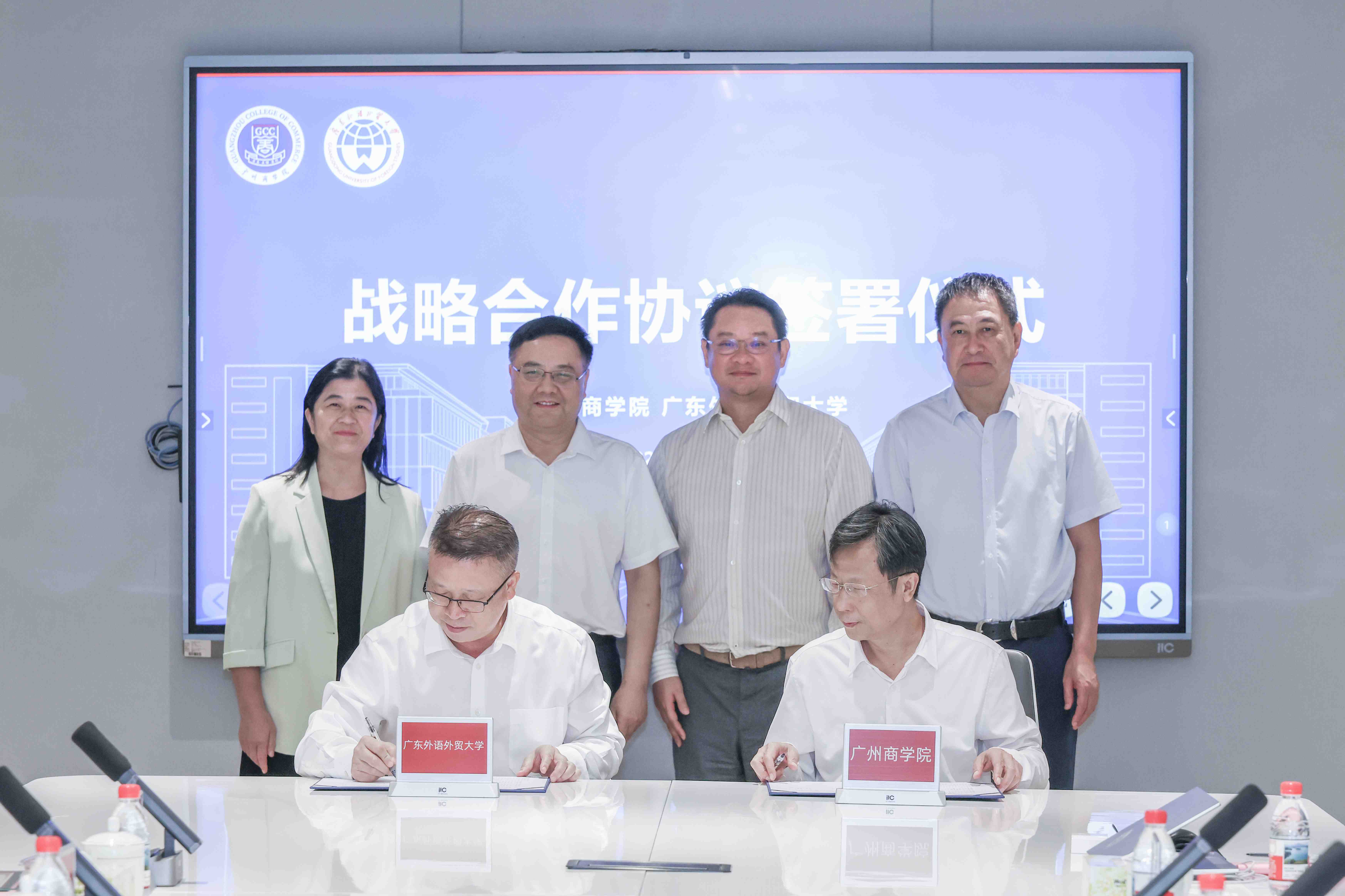 会上,熊建文、谢伟光分别代表广州商学院和广东外语外贸大学共同签署了合作协议,郭小聪、隋广军、石佑启、黄秀娟一起见证了这一重要时刻。未来,双方将围绕资源共享、人才联合培养等方面,全力合作,推进具体落地,为两校教育事业发展、为区域人才培养贡献更大力量。
