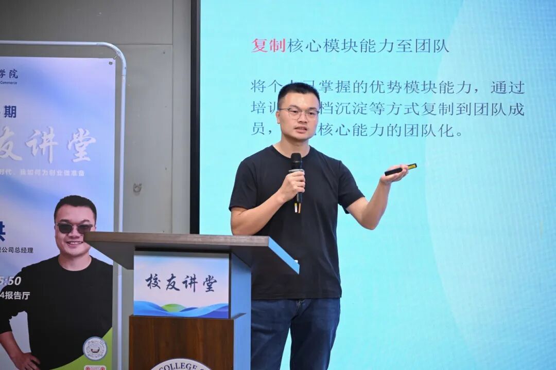 针对大学生创业的智能化准备,苏章洪给出了四点建议。第一,选对赛道。没有热爱,你连爬起来都找不到理由。他建议同学们多去参加行业展会,判断自己是否真的适合。第二,在选定的赛道里做到资深。“100个消费者里,有45个买的是我家的产品,这就是话语权。”第三,拆解组织架构。“去对标公司面试,员工手册里就有,拍个照就知道自己该做什么。”第四,搭建智能化架构。“你现在就开始做,毕业时你已经有了三四年的积累;如果你毕业了才开始,你慢的不只是时间,而是整个时代的风口。时代不会给你第二次机会,但现在开始,一切都还来得及。”