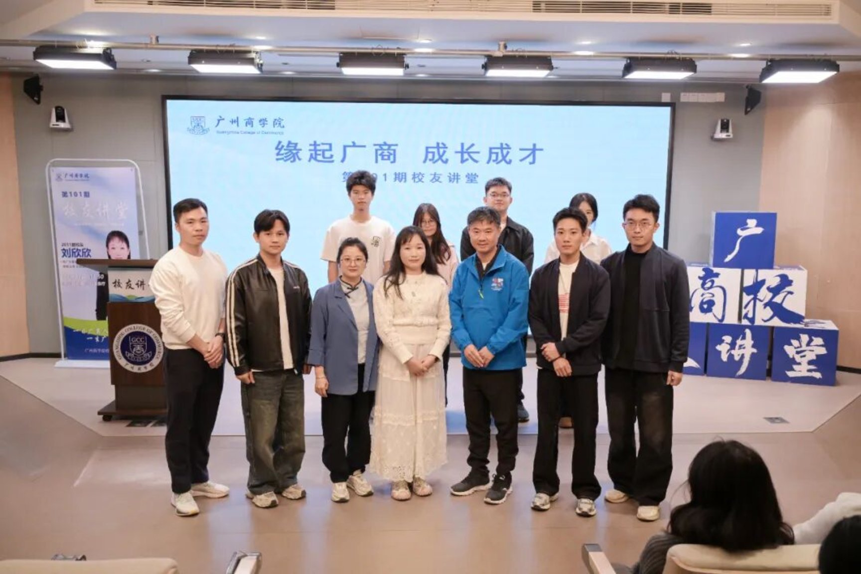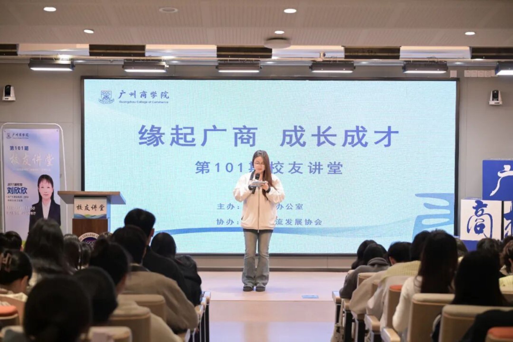 11月27日下午,广州商学院第101期校友讲堂在八教204报告厅顺利举行。本期讲堂特邀2011届校友、海广大家具服务(深圳)有限公司总经理刘欣欣重返母校,以“主动转变,拥抱时代,绽放人生”为主题,与师弟师妹们分享她从法律专业跨界家具行业的精彩历程。学校校友会执行会长、校友办主任、品牌宣传部部长翁楚歆副教授,校友办全体老师及各学院师生代表线上线下共300余人参与本次活动,活动由校友交流发展协会程子涵同学主持。